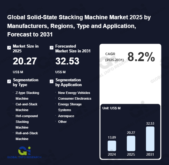 Global Info Research has recently published "Global Solid-State Stacking Machine Market 2026 by Manufacturers, Regions, Type and Application, Forecast to 2032". This report systematically analyzes the current status, future trends (2021-2032), and competitive landscape of the global Solid-State Stacking Machine market. It provides a quantitative analysis from the perspectives of type (Z-type Stacking Machine、 Cut-and-Stack Machine、 Hot-compound Stacking Machine、 Roll-and-Stack Machine), application (New Energy Vehicles、 Consumer Electronics、 Energy Storage Systems、 Aerospace、 Other), regional markets, and major manufacturers (Manz、 DA Technology、 mPLUS CORP、 Guangdong Lyric Robot Automation、 Broadenwin Machinery、 Zhuhai Higrand Technology、 Wuxi Lead Intelligent Equipment、 Shenzhen Colibri Technologies、 Aohong Intelligent Equipment、 Haimuxing Laser Technology、 Funeng Oriental Equipment Technology、 Shenzhen Kejing STAR Technology、 Fenghesheng Intelligent Technology、 Honeycomb Energy Technology、 Wuxi Autowell Technology、 Bozhon PRECISION Industry Technology), comprehensively assessing market opportunities and competitive dynamics.