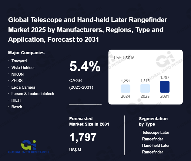 Global Info Research has recently published "Global Telescope and Hand-held Later Rangefinder Market 2026 by Manufacturers, Regions, Type and Application, Forecast to 2032". This report systematically analyzes the current status, future trends (2021-2032), and competitive landscape of the global Telescope and Hand-held Later Rangefinder market. It provides a quantitative analysis from the perspectives of type (Telescope Later Rangefinder、 Hand-held Later Rangefinder), application (Military、 Construction Industry、 Industrial Application、 Sports、 Others), regional markets, and major manufacturers (Trueyard、 Vista Outdoor、 NIKON、 ZEISS、 Leica Camera、 Larsen & Toubro Infotech、 HILTI、 Bosch、 FLUKE、 Mileseey、 Newcon Optik、 Leupold、 OPTi-LOGIC、 BOSMA), comprehensively assessing market opportunities and competitive dynamics.