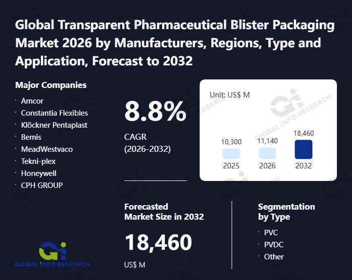 Global Info Research has recently published "Global Transparent Pharmaceutical Blister Packaging Market 2026 by Manufacturers, Regions, Type and Application, Forecast to 2032". This report systematically analyzes the current status, future trends (2021-2032), and competitive landscape of the global Transparent Pharmaceutical Blister Packaging market. It provides a quantitative analysis from the perspectives of type (PVC、 PVDC、 Other), application (Capsule Drug、 Tablets Drug、 Others), regional markets, and major manufacturers (Amcor、 Constantia Flexibles、 Klöckner Pentaplast、 Bemis、 MeadWestvaco、 Tekni-plex、 Honeywell、 CPH GROUP、 Shanghai Haishun、 Bilcare、 IPS Ariflex、 Zhong jin、 Carcano Antonio、 Aluberg、 Goldstonepack), comprehensively assessing market opportunities and competitive dynamics.
