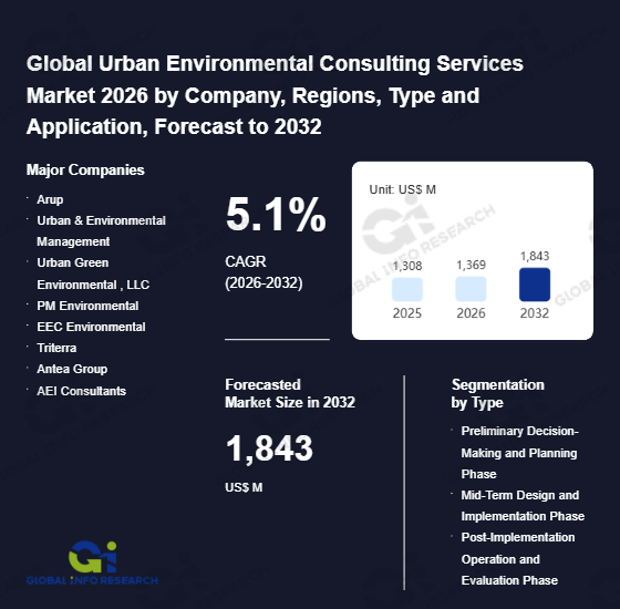 Global Info Research has recently published "Global Urban Environmental Consulting Services Market 2026 by Manufacturers, Regions, Type and Application, Forecast to 2032". This report systematically analyzes the global Urban Environmental Consulting Services market, providing multi-dimensional insights through type (Preliminary Decision-Making and Planning Phase、 Mid-Term Design and Implementation Phase、 Post-Implementation Operation and Evaluation Phase), application (Utilities、 Oil and Gas、 Manufacturing、 Transportation、 Architecture、 Others), regional markets, and major manufacturers (Arup、 Urban & Environmental Management、 Urban Green Environmental , LLC、 PM Environmental、 EEC Environmental、 Triterra、 Antea Group、 AEI Consultants、 Environmental Works、 SWCA、 Ramboll Group、 AKRF、 GAI、 RSB Environmental、 Trium Environmental), assessing the market status, trend evolution, and competitive landscape impact from 2021 to 2032.