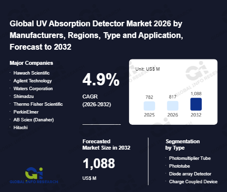 Global Info Research has recently published "Global UV Absorption Detector Market 2026 by Manufacturers, Regions, Type and Application, Forecast to 2032". This report systematically analyzes the global UV Absorption Detector market, providing multi-dimensional insights through type (Photomultiplier Tube、 Phototube、 Diode array Detector、 Charge Coupled Device), application (Chemical Industry、 Scientific Research、 Environmental Monitoring、 Other), regional markets, and major manufacturers (Hawach Scientific、 Agilent Technology、 Waters Corporation、 Shimadzu、 Thermo Fisher Scientific、 PerkinElmer、 AB Sciex (Danaher)、 Hitachi、 Bruker、 Bio-Rad、 Jasco), assessing the market status, trend evolution, and competitive landscape impact from 2021 to 2032.