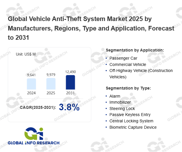 Global Info Research has recently published "Global Vehicle Anti-Theft System Market 2026 by Manufacturers, Regions, Type and Application, Forecast to 2032". This report systematically analyzes the global Vehicle Anti-Theft System market, providing multi-dimensional insights through type (Alarm、 Immobilizer、 Steering Lock、 Passive Keyless Entry、 Central Locking System、 Biometric Capture Device), application (Passenger Car、 Commercial Vehicle、 Off-Highway Vehicle (Construction Vehicles)), regional markets, and major manufacturers (Continental、 Delphi Automotive、 ZF TRW Automotive、 Robert Bosch、 Mitsubishi Electric、 Voxx、 Tokai Rika、 Johnson、 U-Shin), assessing the market status, trend evolution, and competitive landscape impact from 2021 to 2032.