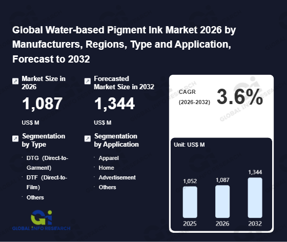 Global Info Research has recently published "Global Water-based Pigment Ink Market 2026 by Manufacturers, Regions, Type and Application, Forecast to 2032". This report systematically analyzes the current status, future trends (2021-2032), and competitive landscape of the global Water-based Pigment Ink market. It provides a quantitative analysis from the perspectives of type (DTG(Direct-to-Garment)、 DTF(Direct-to-Film)、 Others), application (Apparel、 Home、 Advertisement、 Others), regional markets, and major manufacturers (DuPont、 Mimaki、 Eastman Kodak、 INKBANK Group、 Sun Chemical、 Hongsam、 Hangzhou Toka Ink、 STS Inks、 InkTec Europe、 LINKO、 Comax New Material、 Nazdar Ink Technologies、 Procolored、 Ocbestjet Digital Technology、 Xin Flying、 Sublistar、 Wellye Paper Industry、 Polyprint、 YIQIA Digital、 Microtec、 Textek、 Splashjet、 WINNERJET、 Print-Rite、 TrendVision、 Inkwin、 InkSonic、 Sumex Photo、 FIREBIRD Ink、 Chenyang Technology、 Zhuhai Colour Spring Digital Technology), comprehensively assessing market opportunities and competitive dynamics.