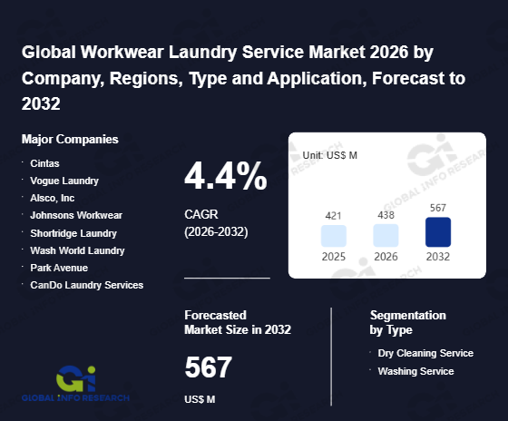 Global Info Research has recently published "Global Workwear Laundry Service Market 2026 by Manufacturers, Regions, Type and Application, Forecast to 2032". This report systematically analyzes the global Workwear Laundry Service market, providing multi-dimensional insights through type (Dry Cleaning Service、 Washing Service), application (Manufacturing、 Chemical Industry、 Life Sciences、 Pharmaceutical、 Oil and Gas、 Hospitality、 Others), regional markets, and major manufacturers (Cintas、 Vogue Laundry、 Alsco, Inc、 Johnsons Workwear、 Shortridge Laundry、 Wash World Laundry、 Park Avenue、 CanDo Laundry Services、 Elis、 Bidvest Laundry Group、 Tibard Laundry Services、 Mopheads、 Giltbrook Workwear、 Lindstrom、 Ballyclare Limited、 JENSEN-GROUP、 Polytex), assessing the market status, trend evolution, and competitive landscape impact from 2021 to 2032.