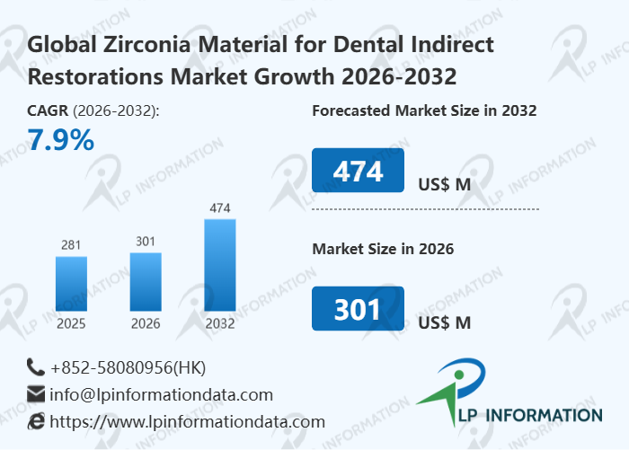 The global Zirconia Material for Dental Indirect Restorations market size is predicted to grow from US$ 281 million in 2025 to US$ 474 million in 2032; it is expected to grow at a CAGR of 7.9% from 2026 to 2032.
