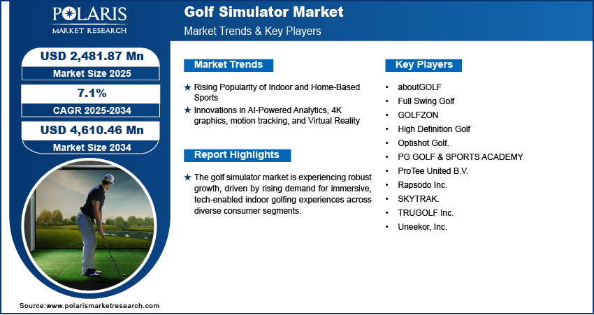 The latest market study published by Polaris Market Research titled Golf Simulator Market Size, Share, Trends, Industry Analysis Report : By Technology Type, Screen Technology (LED, LCD, Projectors), Course Availability, and Application, and Region– Market Forecast, 2025-2034 is designed to provide users with an in-depth understanding of the market. A comprehensive historical analysis of the market is given, along with extensive market forecasts by region/country and subsectors.