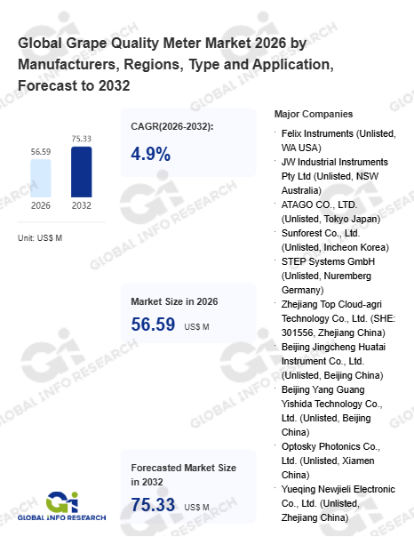 Global Info Research has recently published "Global Grape Quality Meter Market 2026 by Manufacturers, Regions, Type and Application, Forecast to 2032". This report systematically analyzes the global Grape Quality Meter market, providing multi-dimensional insights through type (Portable Type、 Benchtop Type), application (Farm、 Agricultural Product Processing Plant、 Winery、 Other), regional markets, and major manufacturers (Felix Instruments (Unlisted, WA USA)、 JW Industrial Instruments Pty Ltd (Unlisted, NSW Australia)、 ATAGO CO., LTD. (Unlisted, Tokyo Japan)、 Sunforest Co., Ltd. (Unlisted, Incheon Korea)、 STEP Systems GmbH (Unlisted, Nuremberg Germany)、 Zhejiang Top Cloud-agri Technology Co., Ltd. (SHE: 301556, Zhejiang China)、 Beijing Jingcheng Huatai Instrument Co., Ltd. (Unlisted, Beijing China)、 Beijing Yang Guang Yishida Technology Co., Ltd. (Unlisted, Beijing China)、 Optosky Photonics Co., Ltd. (Unlisted, Xiamen China)、 Yueqing Newjieli Electronic Co., Ltd. (Unlisted, Zhejiang China)), assessing the market status, trend evolution, and competitive landscape impact from 2021 to 2032.