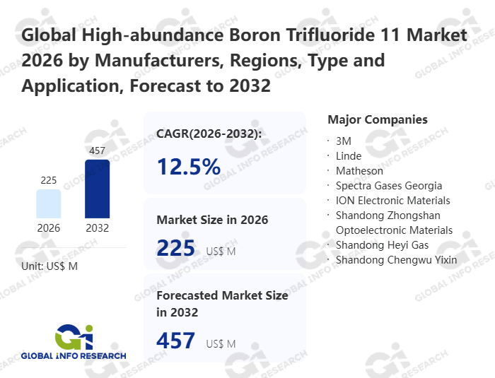 Global Info Research has recently published "Global High-abundance Boron Trifluoride 11 Market 2026 by Manufacturers, Regions, Type and Application, Forecast to 2032". This report systematically analyzes the global High-abundance Boron Trifluoride 11 market, providing multi-dimensional insights through type (≥99.8% 11B Enrichment、 ≥99.9% 11B Enrichment), application (Semiconductor、 Monitor、 Others), regional markets, and major manufacturers (3M、 Linde、 Matheson、 Spectra Gases Georgia、 ION Electronic Materials、 Shandong Zhongshan Optoelectronic Materials、 Shandong Heyi Gas、 Shandong Chengwu Yixin), assessing the market status, trend evolution, and competitive landscape impact from 2021 to 2032.