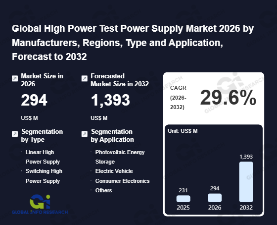 Global Info Research has recently published "Global High Power Test Power Supply Market 2026 by Manufacturers, Regions, Type and Application, Forecast to 2032". This report systematically analyzes the global High Power Test Power Supply market, providing multi-dimensional insights through type (Linear High Power Supply、 Switching High Power Supply), application (Photovoltaic Energy Storage、 Electric Vehicle、 Consumer Electronics、 Others), regional markets, and major manufacturers (AMETEK、 Keysight、 Elektro-Automatik、 KIKUSUI、 Chroma、 ITECH、 Kewell、 Ainuo、 Digatron、 Kratzer、 Bitrode、 Actionpower、 Preen Power、 Wocen Power、 Nebula), assessing the market status, trend evolution, and competitive landscape impact from 2021 to 2032.