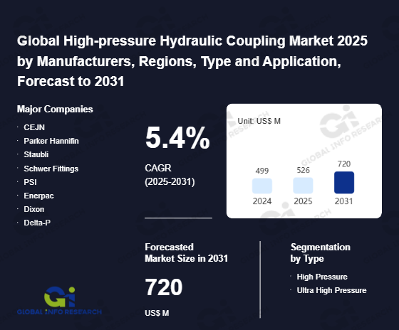 Global Info Research has recently published "Global High-pressure Hydraulic Coupling Market 2026 by Manufacturers, Regions, Type and Application, Forecast to 2032". This report systematically analyzes the global High-pressure Hydraulic Coupling market, providing multi-dimensional insights through type (High Pressure、 Ultra High Pressure), application (Marine Engineering、 Engineering Machinery、 Aerospace、 Others), regional markets, and major manufacturers (CEJN、 Parker Hannifin、 Staubli、 Schwer Fittings、 PSI、 Enerpac、 Dixon、 Delta-P、 Stucchi、 Walther Couplings、 SPIR STAR、 PH Industrie-Hydraulik、 HOLMBURY、 Kurt Hydraulics), assessing the market status, trend evolution, and competitive landscape impact from 2021 to 2032.
