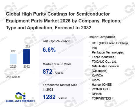 Global Info Research has recently published "Global High Purity Coatings for Semiconductor Equipment Parts Market 2026 by Manufacturers, Regions, Type and Application, Forecast to 2032". This report systematically analyzes the global High Purity Coatings for Semiconductor Equipment Parts market, providing multi-dimensional insights through type (Plasma Spray Coating、 Arc Spray Coating、 Others), application (Semiconductor Etch Equipment、 Deposition (CVD, PVD, ALD)、 Ion Implant Equipment、 Others), regional markets, and major manufacturers (UCT (Ultra Clean Holdings, Inc)、 Pentagon Technologies、 Enpro Industries、 TOCALO Co., Ltd.、 Mitsubishi Chemical (Cleanpart)、 KoMiCo、 Cinos、 Hansol IONES、 WONIK QnC、 DFtech、 TOPWINTECH、 FEMVIX、 SEWON HARDFACING CO.,LTD、 Frontken Corporation Berhad、 Value Engineering Co., Ltd、 KERTZ HIGH TECH、 Hung Jie Technology Corporation、 Oerlikon Balzers、 Beneq、 APS Materials, Inc.、 SilcoTek、 Alumiplate、 Alcadyne、 ASSET Solutions, Inc.、 Jiangsu Kaiweitesi Semiconductor Technology Co., Ltd.、 HCUT Co., Ltd、 Ferrotec (Anhui) Technology Development Co., Ltd、 Shanghai Companion、 Chongqing Genori Technology Co., Ltd、 GRAND HITEK、 HTCSolar、 ULVAC TECHNO, Ltd.、 Technetics Semi), assessing the market status, trend evolution, and competitive landscape impact from 2021 to 2032.