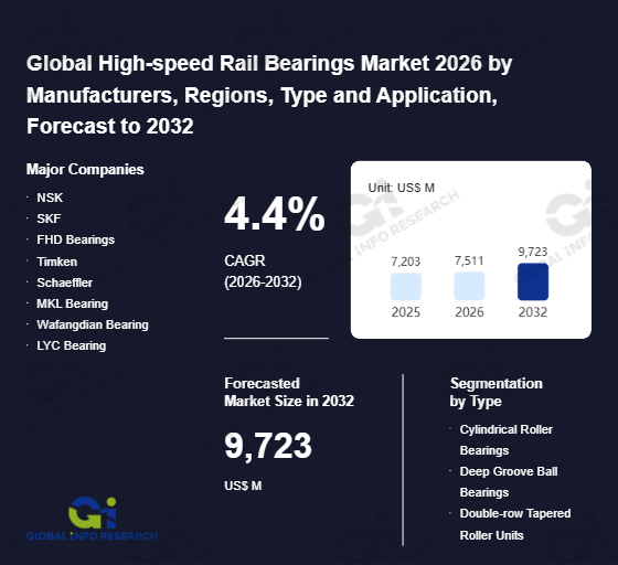 Global Info Research has recently published "Global High-speed Rail Bearings Market 2026 by Manufacturers, Regions, Type and Application, Forecast to 2032". This report systematically analyzes the current status, future trends (2021-2032), and competitive landscape of the global High-speed Rail Bearings market. It provides a quantitative analysis from the perspectives of type (Cylindrical Roller Bearings、 Deep Groove Ball Bearings、 Double-row Tapered Roller Units), application (Axlebox、 Traction Motor、 Others), regional markets, and major manufacturers (NSK、 SKF、 FHD Bearings、 Timken、 Schaeffler、 MKL Bearing、 Wafangdian Bearing、 LYC Bearing), comprehensively assessing market opportunities and competitive dynamics.