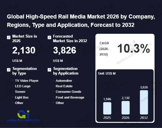 Global Info Research has recently published "Global High-Speed Rail Media Market 2026 by Manufacturers, Regions, Type and Application, Forecast to 2032". This report systematically analyzes the global High-Speed Rail Media market, providing multi-dimensional insights through type (TV Video Player、 LED Large Screen、 Light Box、 Other), application (Automotive、 Real Estate、 Consumer Goods、 Food and Beverage、 Other), regional markets, and major manufacturers (Mega-Info Media Co.,Ltd.、 Yongda Media、 Yinma Media、 Huatie Media、 Changda Media、 Guangzhou Yunhong Jiaze、 Shanghai Chengtie Advertising Media Co., Ltd.、 Gaohe Media、 Asiaray Media Group Limite), assessing the market status, trend evolution, and competitive landscape impact from 2021 to 2032.