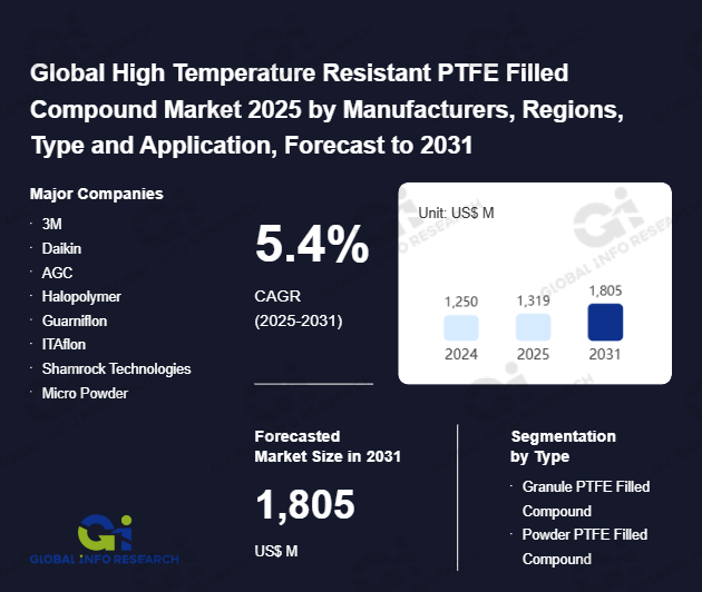 Global Info Research has recently published "Global High Temperature Resistant PTFE Filled Compound Market 2026 by Manufacturers, Regions, Type and Application, Forecast to 2032". This report systematically analyzes the global High Temperature Resistant PTFE Filled Compound market, providing multi-dimensional insights through type (Granule PTFE Filled Compound、 Powder PTFE Filled Compound), application (Automotive、 Industrial、 Electrical and Electronics、 Construction、 Healthcare、 Others), regional markets, and major manufacturers (3M、 Daikin、 AGC、 Halopolymer、 Guarniflon、 ITAflon、 Shamrock Technologies、 Micro Powder、 Gujarat Fluorochemicals、 Nanjin Tianshi、 Röchling Group、 Saint-Gobain Seals、 Greene Tweed、 Fluorseals SpA、 Polyfluor Plastics、 Shandong Dongyue、 Gore), assessing the market status, trend evolution, and competitive landscape impact from 2021 to 2032.