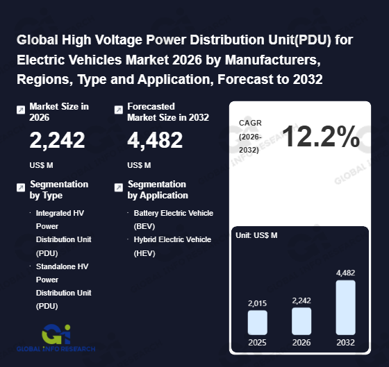 Global Info Research has recently published "Global High Voltage Power Distribution Unit(PDU) for Electric Vehicles Market 2026 by Manufacturers, Regions, Type and Application, Forecast to 2032". This report systematically analyzes the current status, future trends (2021-2032), and competitive landscape of the global High Voltage Power Distribution Unit(PDU) for Electric Vehicles market. It provides a quantitative analysis from the perspectives of type (Integrated HV Power Distribution Unit (PDU)、 Standalone HV Power Distribution Unit (PDU)), application (Battery Electric Vehicle (BEV)、 Hybrid Electric Vehicle (HEV)), regional markets, and major manufacturers (Aptiv、 Eaton、 Continental、 BYD Auto、 VMAX New Energy、 Enpower、 Shinry Technologies、 Suzhou Inovance Automotive Co., Ltd.、 Zhejiang EVTECH、 Huawei、 UAES、 Littelfuse、 EG Electornics、 ECO POWER CO.,LTD、 MIRAE E&I Co., Ltd、 HUBER+SUHNER、 EPEC OY、 Nanjing Kangni、 Ningbo Joyson Electronic、 Senssun Weighing Apparatus Group、 Zhejiang Yonggui Electric Equipment、 Hefei Kainate Photoelectric Technology、 CHANGGAO GROUP、 Suzhou Chilye、 Ebusbar、 Huntkey、 Bit Huachuang), comprehensively assessing market opportunities and competitive dynamics.