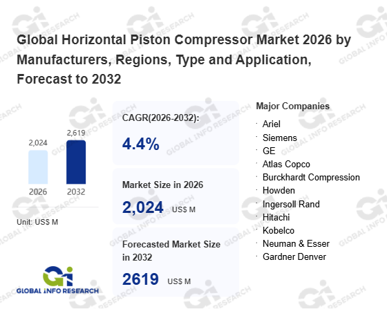 Global Info Research has recently published "Global Horizontal Piston Compressor Market 2026 by Manufacturers, Regions, Type and Application, Forecast to 2032". This report systematically analyzes the global Horizontal Piston Compressor market, providing multi-dimensional insights through type (Single Phase、 2 Phase、 3 Phase、 Others), application (Food & Beverage、 Electronics、 Medical & Dental、 Oil & Gas、 Chemical、 Others), regional markets, and major manufacturers (Ariel、 Siemens、 GE、 Atlas Copco、 Burckhardt Compression、 Howden、 Ingersoll Rand、 Hitachi、 Kobelco、 Neuman & Esser、 Gardner Denver、 Shenyang Blower、 Sundyne、 Atelier Francois、 ABC COMPRESSORS、 KAESER、 Mayekawa、 Corken、 Shenyang Yuanda、 Fu Sheng Industrial), assessing the market status, trend evolution, and competitive landscape impact from 2021 to 2032.