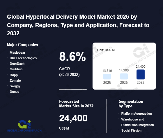 Global Info Research has recently published "Global Hyperlocal Delivery Model Market 2026 by Manufacturers, Regions, Type and Application, Forecast to 2032". This report systematically analyzes the global Hyperlocal Delivery Model market, providing multi-dimensional insights through type (Platform Aggregation、 Warehouse and Distribution Integration、 Social Fission), application (E-commerce、 Instant Retail), regional markets, and major manufacturers (Maplebear、 Uber Technologies、 DoorDash、 Grubhub、 Rappi、 Zomato、 Swiggy、 Dunzo、 Delivery Hero、 Alfred Club、 Ibibogroup、 Laurel & Wolf、 Meituan、 Alibaba Group、 goPuff、 Handy、 Foodpanda Group、 Airtasker、 Takeaway.com、 ANI Technologies、 AskForTask、 Groupon), assessing the market status, trend evolution, and competitive landscape impact from 2021 to 2032.