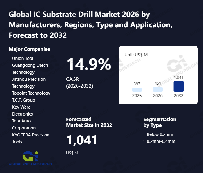 Global Info Research has recently published "Global IC Substrate Drill Market 2026 by Manufacturers, Regions, Type and Application, Forecast to 2032". This report systematically analyzes the global IC Substrate Drill market, providing multi-dimensional insights through type (Below 0.2mm、 0.2mm-0.4mm), application (FC-BGA、 FC-CSP、 WB BGA、 WB CSP、 RF Module、 Others), regional markets, and major manufacturers (Union Tool、 Guangdong Dtech Technology、 Jinzhou Precision Technology、 Topoint Technology、 T.C.T. Group、 Key Ware Electronics、 Tera Auto Corporation、 KYOCERA Precision Tools、 HAM Precision、 Tungaloy、 Xiamen Xiazhi Technology Tool、 IND-SPHINX Precision、 Xinxiang Good Team Electronics、 Longnan Huaying Precision), assessing the market status, trend evolution, and competitive landscape impact from 2021 to 2032.