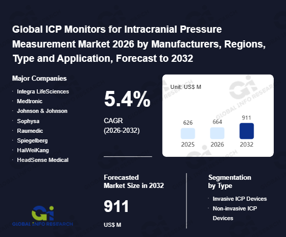 Global Info Research has recently published "Global ICP Monitors for Intracranial Pressure Measurement Market 2026 by Manufacturers, Regions, Type and Application, Forecast to 2032". This report systematically analyzes the current status, future trends (2021-2032), and competitive landscape of the global ICP Monitors for Intracranial Pressure Measurement market. It provides a quantitative analysis from the perspectives of type (Invasive ICP Devices、 Non-invasive ICP Devices), application (Traumatic Brain Injury、 Intracerebral Hemorrhage、 Meningitis、 Subarachnoid Hemorrhage、 Others), regional markets, and major manufacturers (Integra LifeSciences、 Medtronic、 Johnson & Johnson、 Sophysa、 Raumedic、 Spiegelberg、 HaiWeiKang、 HeadSense Medical、 Vittamed、 Comen、 PrimaNova、 TALEND MEDICAL), comprehensively assessing market opportunities and competitive dynamics.