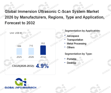 Global Info Research has recently published "Global Immersion Ultrasonic C-Scan System Market 2026 by Manufacturers, Regions, Type and Application, Forecast to 2032". This report systematically analyzes the global Immersion Ultrasonic C-Scan System market, providing multi-dimensional insights through type (Portable、 Desktop), application (Aerospace、 Transportation、 Metal Processing、 Others), regional markets, and major manufacturers (ScanMaster、 TecScan、 PAC、 Baker Hughes、 Analysis、 GE、 Structural Diagnostics、 Mistras Group、 Blue Star Limited、 Hiwave、 Beijing North Star、 Wuhan Zhongke Innovation Technology、 Allrising(Beijing) Technology、 Guangdong Shantou Ultrasonic Electronics、 Cangzhou Optic Detection Instrument、 Beijing Caisheng Technology), assessing the market status, trend evolution, and competitive landscape impact from 2021 to 2032.