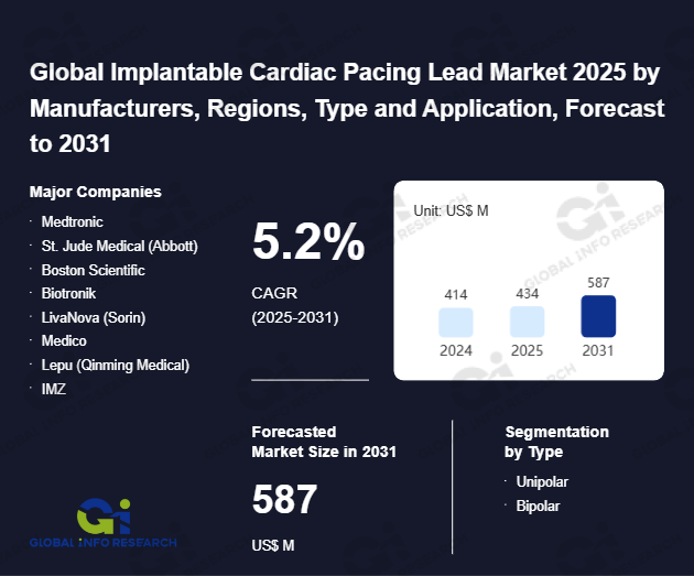 Global Info Research has recently published "Global Implantable Cardiac Pacing Lead Market 2026 by Manufacturers, Regions, Type and Application, Forecast to 2032". This report systematically analyzes the global Implantable Cardiac Pacing Lead market, providing multi-dimensional insights through type (Unipolar、 Bipolar), application (Bradycardia、 Tachycardia、 Heart Failure、 Other), regional markets, and major manufacturers (Medtronic、 St. Jude Medical (Abbott)、 Boston Scientific、 Biotronik、 LivaNova (Sorin)、 Medico、 Lepu (Qinming Medical)、 IMZ、 Cardioelectronica、 Pacetronix), assessing the market status, trend evolution, and competitive landscape impact from 2021 to 2032.