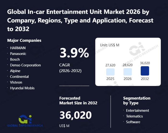 Global Info Research has recently published "Global In-car Entertainment Unit Market 2026 by Manufacturers, Regions, Type and Application, Forecast to 2032". This report systematically analyzes the global In-car Entertainment Unit market, providing multi-dimensional insights through type (Entertainment、 Telematics、 Software), application (Passenger Car、 Commercial Vehicle), regional markets, and major manufacturers (HARMAN、 Panasonic、 Bosch、 Denso Corporation、 Alpine、 Continental、 Visteon、 Hyundai Mobis、 LG、 Pioneer、 Marelli、 Joyson、 Desay SV、 Clarion、 Dhautoware、 Motrex Co), assessing the market status, trend evolution, and competitive landscape impact from 2021 to 2032.