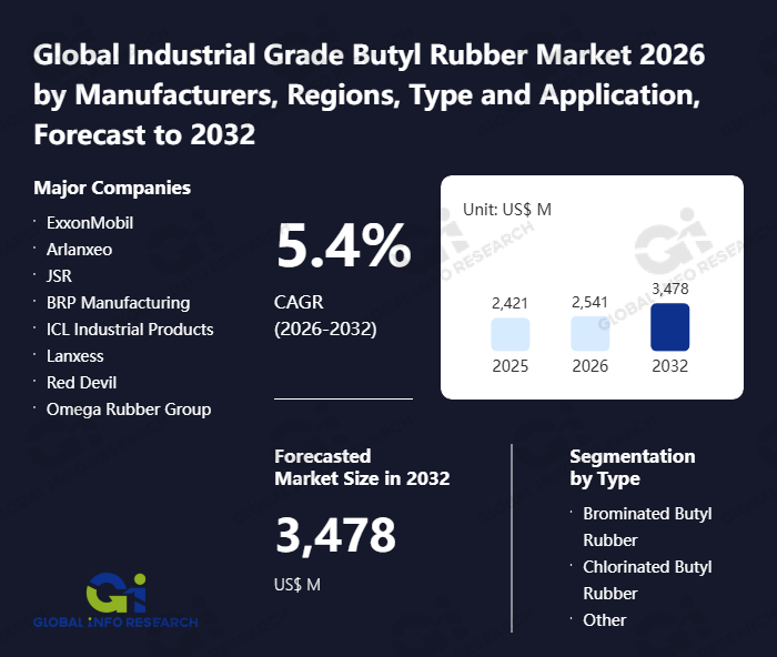 Global Info Research has recently published "Global Industrial Grade Butyl Rubber Market 2026 by Manufacturers, Regions, Type and Application, Forecast to 2032". This report systematically analyzes the current status, future trends (2021-2032), and competitive landscape of the global Industrial Grade Butyl Rubber market. It provides a quantitative analysis from the perspectives of type (Brominated Butyl Rubber、 Chlorinated Butyl Rubber、 Other), application (Automobile Industry、 Architecture、 Medical Packaging、 Others), regional markets, and major manufacturers (ExxonMobil、 Arlanxeo、 JSR、 BRP Manufacturing、 ICL Industrial Products、 Lanxess、 Red Devil、 Omega Rubber Group、 Ataman、 Zhejiang Cenway Materials、 Shandong Jingbo Zhongju New Material), comprehensively assessing market opportunities and competitive dynamics.