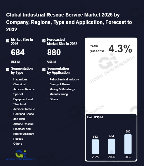 Global Info Research has recently published "Global Industrial Rescue Service Market 2026 by Manufacturers, Regions, Type and Application, Forecast to 2032". This report systematically analyzes the current status, future trends (2021-2032), and competitive landscape of the global Industrial Rescue Service market. It provides a quantitative analysis from the perspectives of type (Hazardous Chemical Accident Rescue、 Special Equipment and Structural Accident Rescue、 Confined Space and High-Altitude Rescue、 Electrical and Energy Accident Rescue、 Others), application (Petrochemical Industry、 Energy & Power、 Mining & Metallurgy、 Manufacturing、 Others), regional markets, and major manufacturers (Ancon、 Falck、 Ferrous Protection、 First Choice Safety Solutions、 Irwin's Safety、 JMAC Group、 Maddox Industrial Group、 Med-Tex Services、 MRS Training & Rescue、 Onsite Rescue、 Raven Engineering Group、 Red One Ltd、 Rescue2、 RNR Rescue、 Roco Rescue、 Specialty Industrial Group、 Spectrum Safety Group、 Total Group、 Total Safety、 Tundra Rescue), comprehensively assessing market opportunities and competitive dynamics.