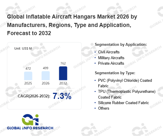 Global Info Research has recently published "Global Inflatable Aircraft Hangars Market 2026 by Manufacturers, Regions, Type and Application, Forecast to 2032". This report systematically analyzes the current status, future trends (2021-2032), and competitive landscape of the global Inflatable Aircraft Hangars market. It provides a quantitative analysis from the perspectives of type (PVC (Polyvinyl Chloride) Coated Fabric、 TPU (Thermoplastic Polyurethane) Coated Fabric、 Silicone Rubber Coated Fabric、 Others), application (Civil Aircrafts、 Military Aircrafts、 Private Aircrafts), regional markets, and major manufacturers (Aviatech、 Buildair、 Aviatema、 Vertigo、 JB Roche、 TENTER Inflatables、 Vector、 IndustrialDome、 Gauss Inflatable Tech、 Bollair Outdoor Product、 Hydro.aero、 Njord Air、 InNature Manufacturer、 Cover Technology、 Dianzi Technology), comprehensively assessing market opportunities and competitive dynamics.