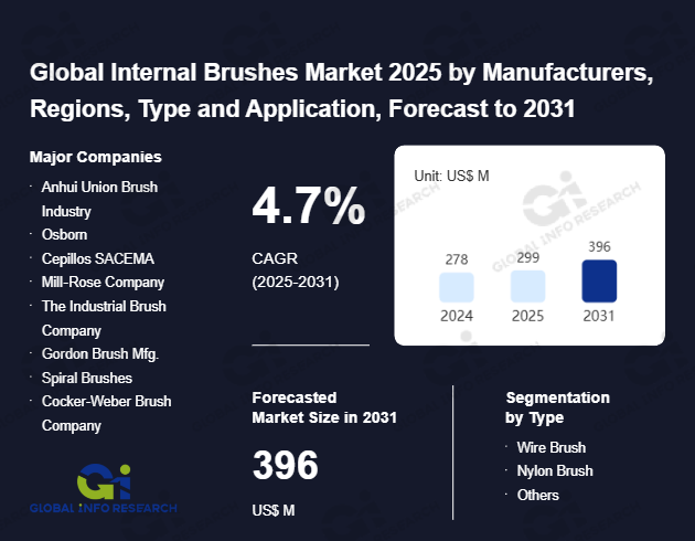Global Info Research has recently published "Global Internal Brushes Market 2026 by Manufacturers, Regions, Type and Application, Forecast to 2032". This report systematically analyzes the current status, future trends (2021-2032), and competitive landscape of the global Internal Brushes market. It provides a quantitative analysis from the perspectives of type (Wire Brush、 Nylon Brush、 Others), application (Automotive Manufacturing、 Food Processing、 Medical and Pharmaceutical、 Others), regional markets, and major manufacturers (Anhui Union Brush Industry、 Osborn、 Cepillos SACEMA、 Mill‑Rose Company、 The Industrial Brush Company、 Gordon Brush Mfg.、 Spiral Brushes、 Cocker-Weber Brush Company、 Industrial Brush Corporation、 Micronova Manufacturing、 Precision Brush、 3M、 Carolina Brush、 Fuller Industries、 Robert Bosch GmbH、 Tanis Brush、 Unimade Industry、 Cominix), comprehensively assessing market opportunities and competitive dynamics.