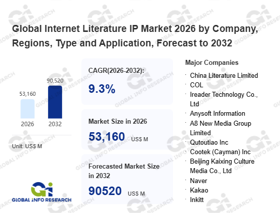 Global Info Research has recently published "Global Internet Literature IP Market 2026 by Manufacturers, Regions, Type and Application, Forecast to 2032". This report systematically analyzes the global Internet Literature IP market, providing multi-dimensional insights through type (Realistic Literature、 Science Fiction Literature、 Other), application (Film and TV Dramas、 Anime、 Game、 Other), regional markets, and major manufacturers (China Literature Limited、 COL、 Ireader Technology Co., Ltd、 Anysoft Information、 A8 New Media Group Limited、 Qutoutiao Inc、 Cootek (Cayman) Inc、 Beijing Kaixing Culture Media Co., Ltd、 Naver、 Kakao、 Inkitt), assessing the market status, trend evolution, and competitive landscape impact from 2021 to 2032.