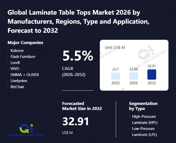 Global Info Research has recently published "Global Laminate Table Tops Market 2026 by Manufacturers, Regions, Type and Application, Forecast to 2032". This report systematically analyzes the global Laminate Table Tops market, providing multi-dimensional insights through type (High-Pressure Laminate (HPL)、 Low-Pressure Laminate (LPL)), application (Commercial、 Residential), regional markets, and major manufacturers (Kaboon、 Flash Furniture、 Lorell、 VIVO、 EMMA + OLIVER、 Livelynine、 BizChair), assessing the market status, trend evolution, and competitive landscape impact from 2021 to 2032.