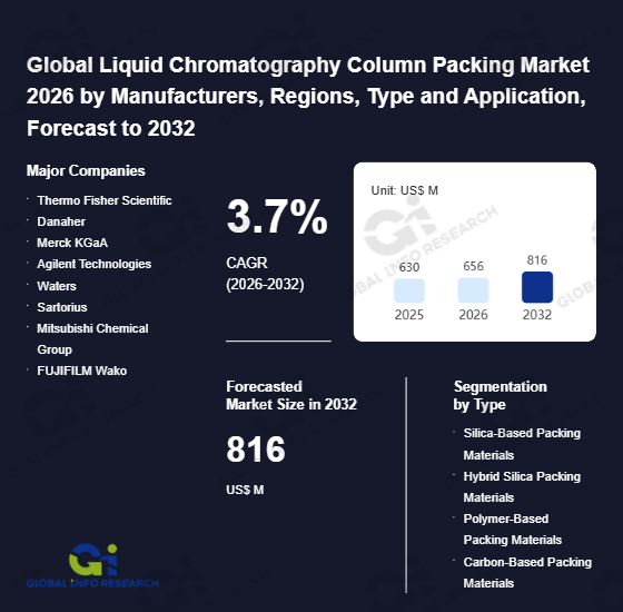 Global Info Research has recently published "Global Liquid Chromatography Column Packing Market 2026 by Manufacturers, Regions, Type and Application, Forecast to 2032". This report systematically analyzes the global Liquid Chromatography Column Packing market, providing multi-dimensional insights through type (Silica-Based Packing Materials、 Hybrid Silica Packing Materials、 Polymer-Based Packing Materials、 Carbon-Based Packing Materials), application (Pharmaceutical、 Chemical Synthesis、 Biological Purification、 Others), regional markets, and major manufacturers (Thermo Fisher Scientific、 Danaher、 Merck KGaA、 Agilent Technologies、 Waters、 Sartorius、 Mitsubishi Chemical Group、 FUJIFILM Wako、 Repligen、 Bio-Rad Laboratories、 YMC、 Shimadzu、 Tosoh、 Daicel、 Osaka Soda、 NanoMicro Tech、 Suzhou Sepax Technologies、 Kaneka、 Gltechno Holdings), assessing the market status, trend evolution, and competitive landscape impact from 2021 to 2032.