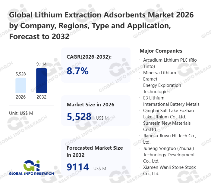 Global Info Research has recently published "Global Lithium Extraction Adsorbents Market 2026 by Manufacturers, Regions, Type and Application, Forecast to 2032". This report systematically analyzes the global Lithium Extraction Adsorbents market, providing multi-dimensional insights through type (Aluminum Molecular Sieve Adsorbent、 Manganese Ion Sieve Adsorbent、 Titanium Ion Sieve Adsorbent、 Doped Ion Sieve), application (High Magnesium-lithium Ratio Salt Lake Brine、 High Sodium-lithium Ratio Salt Lake Brine、 Oil and Gas Associated Brine、 Lithium-ion Battery Recycling、 Other), regional markets, and major manufacturers (Arcadium Lithium PLC (Rio Tinto)、 Minerva Lithium、 Eramet、 Energy Exploration Technologies、 E3 Lithium、 International Battery Metals、 Qinghai Salt Lake Fozhao Lake Lithium Co., Ltd.、 Sunresin New Materials Co.Ltd、 Jiangsu Jiuwu Hi-Tech Co., Ltd.、 Juneng Yongtuo (Zhuhai) Technology Development Co., Ltd.、 Xiamen Wanli Stone Stock Co., Ltd.、 Lanshen New Materials、 Jiangsu Haipu Functional Materials Co., Ltd.、 Beijing Originwater Technology Co., Ltd.、 Inter-china Chemical Co., Limited.、 Qinghaikuajie), assessing the market status, trend evolution, and competitive landscape impact from 2021 to 2032.