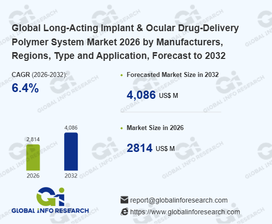 Global Info Research has recently published "Global Long-Acting Implant & Ocular Drug-Delivery Polymer System Market 2026 by Manufacturers, Regions, Type and Application, Forecast to 2032". This report systematically analyzes the current status, future trends (2021-2032), and competitive landscape of the global Long-Acting Implant & Ocular Drug-Delivery Polymer System market. It provides a quantitative analysis from the perspectives of type (Subcutaneous and Intramuscular Implants、 Intravitreal and Ocular Implants), application (Hospital、 Dental Clinic、 Other), regional markets, and major manufacturers (Novartis、 Alcon、 Johnson & Johnson、 Bausch + Lomb、 EyePoint Pharmaceuticals、 Regeneron Pharmaceuticals、 Santen Pharmaceutical、 Allergan (AbbVie)、 Alimera Sciences、 Ocular Therapeutix、 Graybug Vision、 Aerie Pharmaceuticals、 Neurotech Pharmaceuticals、 Teva Pharmaceutical Industries、 Sun Pharmaceutical Industries、 EyeGate Pharmaceuticals、 PolyActiva、 EyeD Pharma、 Ripple Therapeutics、 Re‑Vana Therapeutics), comprehensively assessing market opportunities and competitive dynamics.