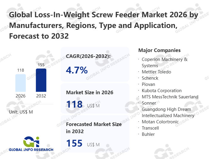 Global Info Research has recently published "Global Loss-In-Weight Screw Feeder Market 2026 by Manufacturers, Regions, Type and Application, Forecast to 2032". This report systematically analyzes the current status, future trends (2021-2032), and competitive landscape of the global Loss-In-Weight Screw Feeder market. It provides a quantitative analysis from the perspectives of type (Single Screw Loss-in-Weight Feeder、 Twin Screw Loss-in-Weight Feeder), application (Plastic Industry、 Food Industry、 Mining Industry、 Construction Industry、 Chemical Industry、 Other), regional markets, and major manufacturers (Coperion Machinery & Systems、 Mettler Toledo、 Schenck、 Piovan、 Kubota Corporation、 MTS MessTechnik Sauerland、 Sonner、 Guangdong High Dream Intellectualized Machinery、 Motan Colortronic、 Transcell、 Buhler、 ONGOAL、 WAMGROUP、 CPM、 AZO、 Vibra Screw), comprehensively assessing market opportunities and competitive dynamics.