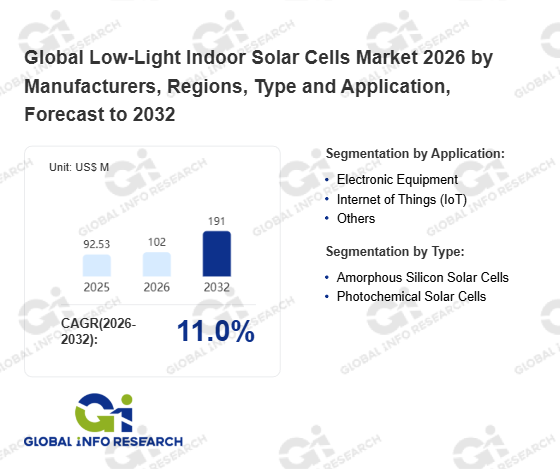 Global Info Research has recently published "Global Low-Light Indoor Solar Cells Market 2026 by Manufacturers, Regions, Type and Application, Forecast to 2032". This report systematically analyzes the global Low-Light Indoor Solar Cells market, providing multi-dimensional insights through type (Amorphous Silicon Solar Cells、 Photochemical Solar Cells), application (Electronic Equipment、 Internet of Things (IoT)、 Others), regional markets, and major manufacturers (PowerFilm、 Panasonic、 Ricoh、 Fujikura、 3GSolar、 Greatcell Energy (Dyesol)、 Exeger (Fortum)、 Sony、 Sharp Corporation、 Peccell、 Solaronix、 Oxford PV、 G24 Power、 SOLEMS、 Kaneka、 Topray Solar、 Chuangyi Solar、 Shenzhen Rihuan Solar、 Dazen (Jiangsu) Micro-Nano Technology、 Guangdong Mailuo Energy Technology), assessing the market status, trend evolution, and competitive landscape impact from 2021 to 2032.