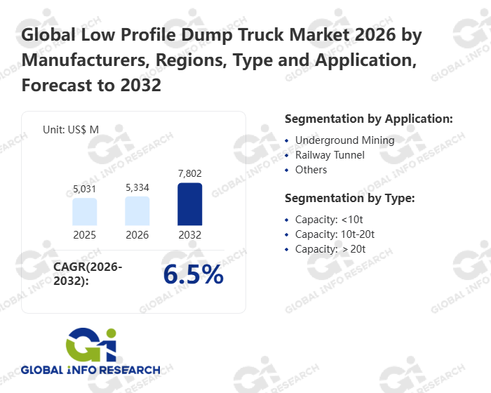 Global Info Research has recently published "Global Low Profile Dump Truck Market 2026 by Manufacturers, Regions, Type and Application, Forecast to 2032". This report systematically analyzes the global Low Profile Dump Truck market, providing multi-dimensional insights through type (Capacity: <10t、 Capacity: 10t-20t、 Capacity: >20t), application (Underground Mining、 Railway Tunnel、 Others), regional markets, and major manufacturers (Eimco Elecon、 Aramine、 KSQ、 RIMEA、 Jinan Lingong Mining Equipment Technology Co., Ltd.、 GHH、 Baker Hughes、 Hydrema、 Bell Equipment、 BERGMANN), assessing the market status, trend evolution, and competitive landscape impact from 2021 to 2032.