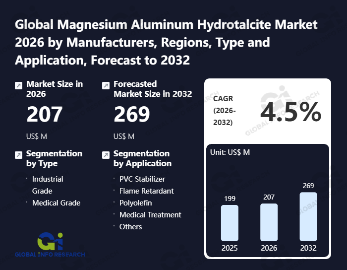 Global Info Research has recently published "Global Magnesium Aluminum Hydrotalcite Market 2026 by Manufacturers, Regions, Type and Application, Forecast to 2032". This report systematically analyzes the global Magnesium Aluminum Hydrotalcite market, providing multi-dimensional insights through type (Industrial Grade、 Medical Grade), application (PVC Stabilizer、 Flame Retardant、 Polyolefin、 Medical Treatment、 Others), regional markets, and major manufacturers (Kyowa Chemical Industry、 Clariant、 Doobon、 Sakai Chemical Industry、 Sinwon Chemical、 Sasol、 Akdeniz Chemson、 GCH Technology、 BELIKE Chemical), assessing the market status, trend evolution, and competitive landscape impact from 2021 to 2032.
