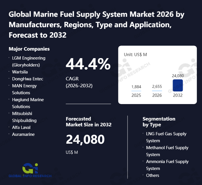 Global Info Research has recently published "Global Marine Fuel Supply System Market 2026 by Manufacturers, Regions, Type and Application, Forecast to 2032". This report systematically analyzes the global Marine Fuel Supply System market, providing multi-dimensional insights through type (LNG Fuel Gas Supply System、 Methanol Fuel Supply System、 Ammonia Fuel Supply System、 Others), application (Cargo Ships、 Bunkering Ships), regional markets, and major manufacturers (LGM Engineering (Gloryholders)、 Wartsila、 DongHwa Entec、 MAN Energy Solutions、 Høglund Marine Solutions、 Mitsubishi Shipbuilding、 Alfa Laval、 Auramarine、 TGE Marine Gas Engineering、 Kongsberg Maritime、 CSSC、 Headway Technology Group (Qingdao) Co., Ltd.、 Torgy LNG、 C-LNG Solutions Pte. Ltd、 COSCO Shipping、 Blue Soul), assessing the market status, trend evolution, and competitive landscape impact from 2021 to 2032.