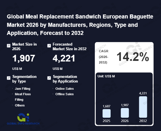 Global Info Research has recently published "Global Meal Replacement Sandwich European Baguette Market 2026 by Manufacturers, Regions, Type and Application, Forecast to 2032". This report systematically analyzes the global Meal Replacement Sandwich European Baguette market, providing multi-dimensional insights through type (Jam Filling、 Meat Floss Filling、 Others), application (Online Sales、 Offline Sales), regional markets, and major manufacturers (Wuhan Baiyilai Technology、 Hangzhou Light Food Health Technology、 Zhengzhou Haoweizhi Trading、 Changshan (Guangzhou) Biotechnology、 Shandong Caipiao Food、 Three Squirrels Inc.、 Bestore、 Toly Bread、 Shanghai Mint Health Technology、 BreadTalk Group), assessing the market status, trend evolution, and competitive landscape impact from 2021 to 2032.
