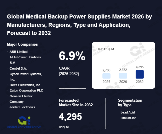 Global Info Research has recently published "Global Medical Backup Power Supplies Market 2026 by Manufacturers, Regions, Type and Application, Forecast to 2032". This report systematically analyzes the global Medical Backup Power Supplies market, providing multi-dimensional insights through type (Lead Acid、 Lithium-ion), application (Hospital、 Laboratory、 Specialty Clinic), regional markets, and major manufacturers (ABB Limited、 AEG Power Solutions B.V.、 Centiel S.A.、 CyberPower Systems, Inc.、 Delta Electronics, Inc.、 Eaton Corporation PLC、 General Electric Company、 Jeidar Electronics、 Kehua Data Co., Ltd.、 Kohler Uninterruptible Power Limited、 Legrand S.A.、 Luminous Power Technologies Pvt. Ltd.、 Marathon Power Inc.、 Microtek International Pvt Ltd.、 Mitsubishi Electric Corporation、 Riello Elettronica SpA、 Rockwell Automation、 Sendon International Ltd.、 Shenzhen SORO Electronics Co., Ltd.、 Toshiba Corporation、 Vertiv Holding Corporation), assessing the market status, trend evolution, and competitive landscape impact from 2021 to 2032.