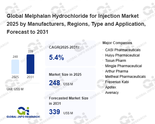 Global Info Research has recently published "Global Melphalan Hydrochloride for Injection Market 2026 by Manufacturers, Regions, Type and Application, Forecast to 2032". This report systematically analyzes the current status, future trends (2021-2032), and competitive landscape of the global Melphalan Hydrochloride for Injection market. It provides a quantitative analysis from the perspectives of type (Original Drug、 Generic Drug), application (Hospital、 Clinic、 Others), regional markets, and major manufacturers (CASI Pharmaceuticals、 Huiyu Pharmaceutical、 Tosun Pharm、 Mingjie Pharmaceutical、 Arthur Pharma、 Meitheal Pharmaceuticals、 Fresenius Kabi、 Apotex、 Avenacy), comprehensively assessing market opportunities and competitive dynamics.