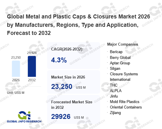 Global Info Research has recently published "Global Metal and Plastic Caps & Closures Market 2026 by Manufacturers, Regions, Type and Application, Forecast to 2032". This report systematically analyzes the global Metal and Plastic Caps & Closures market, providing multi-dimensional insights through type (Screw、 Flip-top、 Press、 Spout、 Other), application (Beverage and Food、 Beer and Wine、 Pharmaceutical Industry、 Personal Care Products、 Other), regional markets, and major manufacturers (Bericap、 Berry Global、 Aptar Group、 Silgan、 Closure Systems International、 THC、 ALPLA、 Jinfu、 Mold Rite Plastics、 Oriental Containers、 Zijiang、 Blackhawk Molding、 ZhongFu、 Mocap、 CREALIS、 Guala Closures Group、 Amcor、 Berlin Packaging、 Huayue Group), assessing the market status, trend evolution, and competitive landscape impact from 2021 to 2032.