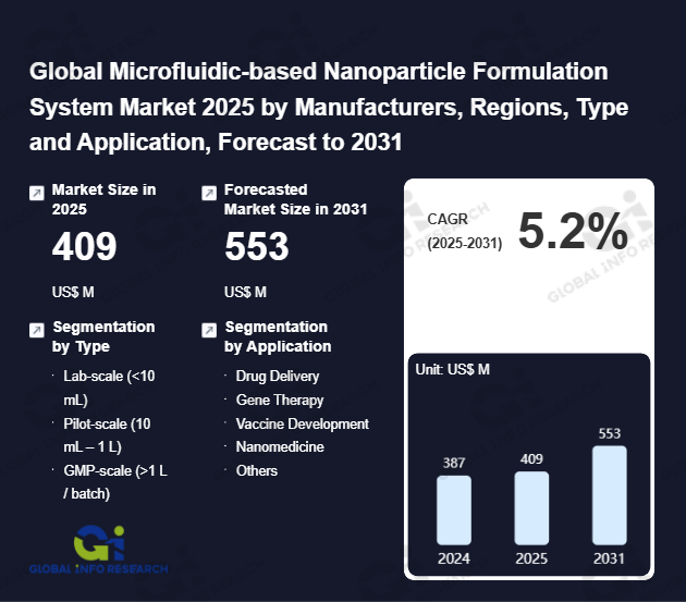 Global Info Research has recently published "Global Microfluidic-based Nanoparticle Formulation System Market 2026 by Manufacturers, Regions, Type and Application, Forecast to 2032". This report systematically analyzes the current status, future trends (2021-2032), and competitive landscape of the global Microfluidic-based Nanoparticle Formulation System market. It provides a quantitative analysis from the perspectives of type (Lab-scale (<10 mL)、 Pilot-scale (10 mL – 1 L)、 GMP-scale (>1 L / batch)), application (Drug Delivery、 Gene Therapy、 Vaccine Development、 Nanomedicine、 Others), regional markets, and major manufacturers (Cytiva、 Inside Therapeutics、 Unchained Labs、 MEPSGEN、 Particle Works、 Malvern Panalytical、 Precigenome、 KNAUER、 Helix Biotech), comprehensively assessing market opportunities and competitive dynamics.