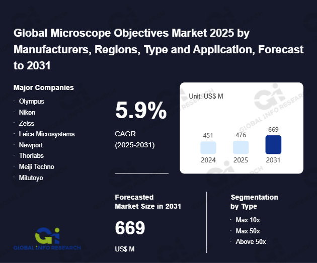 Global Info Research has recently published "Global Microscope Objectives Market 2026 by Manufacturers, Regions, Type and Application, Forecast to 2032". This report systematically analyzes the global Microscope Objectives market, providing multi-dimensional insights through type (Max 10x、 Max 50x、 Above 50x), application (Medical Center、 Research Center、 Other), regional markets, and major manufacturers (Olympus、 Nikon、 Zeiss、 Leica Microsystems、 Newport、 Thorlabs、 Meiji Techno、 Mitutoyo、 Navitar、 Motic), assessing the market status, trend evolution, and competitive landscape impact from 2021 to 2032.