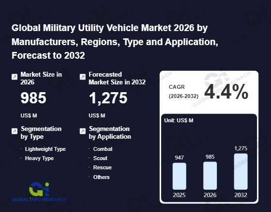 Global Info Research has recently published "Global Military Utility Vehicle Market 2026 by Manufacturers, Regions, Type and Application, Forecast to 2032". This report systematically analyzes the global Military Utility Vehicle market, providing multi-dimensional insights through type (Lightweight Type、 Heavy Type), application (Combat、 Scout、 Rescue、 Others), regional markets, and major manufacturers (IDV Iveco Defence Vehicles、 AM General、 Polaris Government & Defense、 NIMR、 Oshkosh Defense、 STREIT Group、 INKAS Armored、 Lockheed Martin、 Northrop Grumman、 BAE Systems、 Elbit Systems), assessing the market status, trend evolution, and competitive landscape impact from 2021 to 2032.