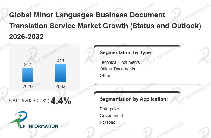 The global Minor Languages Business Document Translation Service market size is predicted to grow from US$ 238 million in 2025 to US$ 319 million in 2032; it is expected to grow at a CAGR of 4.4% from 2026 to 2032.