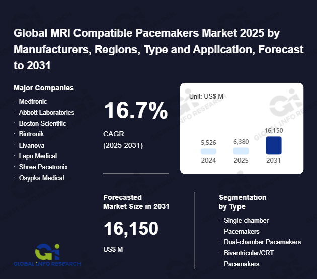 Global Info Research has recently published "Global MRI Compatible Pacemakers Market 2026 by Manufacturers, Regions, Type and Application, Forecast to 2032". This report systematically analyzes the current status, future trends (2021-2032), and competitive landscape of the global MRI Compatible Pacemakers market. It provides a quantitative analysis from the perspectives of type (Single-chamber Pacemakers、 Dual-chamber Pacemakers、 Biventricular/CRT Pacemakers), application (Hospitals & Cardiac Centers、 Ambulatory Surgical Centers), regional markets, and major manufacturers (Medtronic、 Abbott Laboratories、 Boston Scientific、 Biotronik、 Livanova、 Lepu Medical、 Shree Pacetronix、 Osypka Medical、 Medico、 Oscor), comprehensively assessing market opportunities and competitive dynamics.