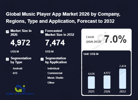 Global Info Research has recently published "Global Music Player App Market 2026 by Manufacturers, Regions, Type and Application, Forecast to 2032". This report systematically analyzes the global Music Player App market, providing multi-dimensional insights through type (Android、 iOS), application (Individual、 Commercial、 Music Studio、 Other), regional markets, and major manufacturers (AIMP、 jetAudio、 MediaMonkey、 Musicolet、 PlayerPro、 Plexamp、 Pulsar、 Stellio、 Symfonium、 Neutron Player、 Poweramp、 YouTube Music、 Spotify、 Shuttle 2、 foobar2000、 VLC、 Deezer、 iHeartRadio、 Tidal), assessing the market status, trend evolution, and competitive landscape impact from 2021 to 2032.